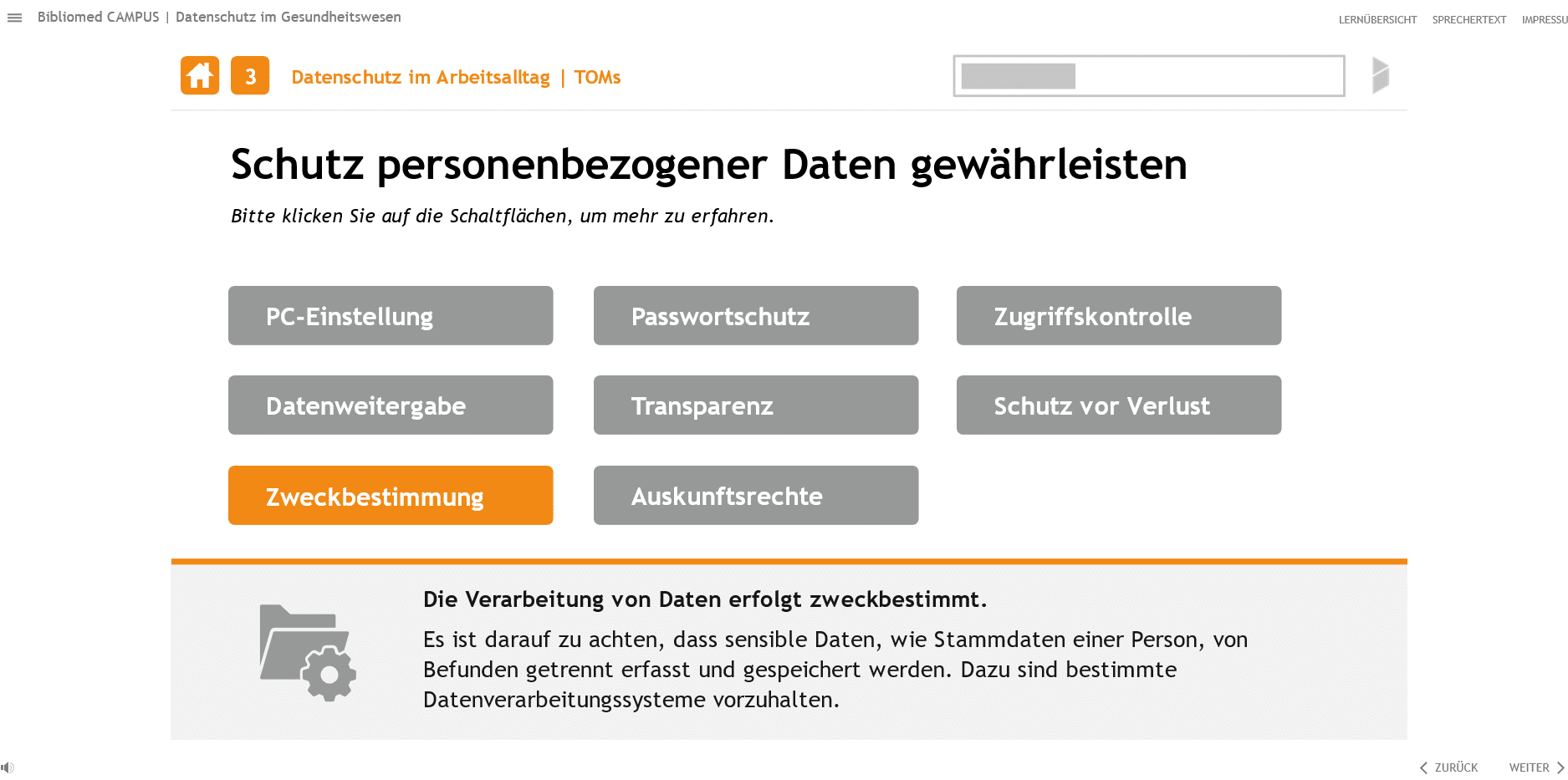 Das Online-Training ist vertont und enthält den Sprechertext zum Nachlesen. Es richtet sich an alle professionell Pflegenden sowie alle Mitarbeitenden, die die Regeln des Datenschutzes beachten müssen.
