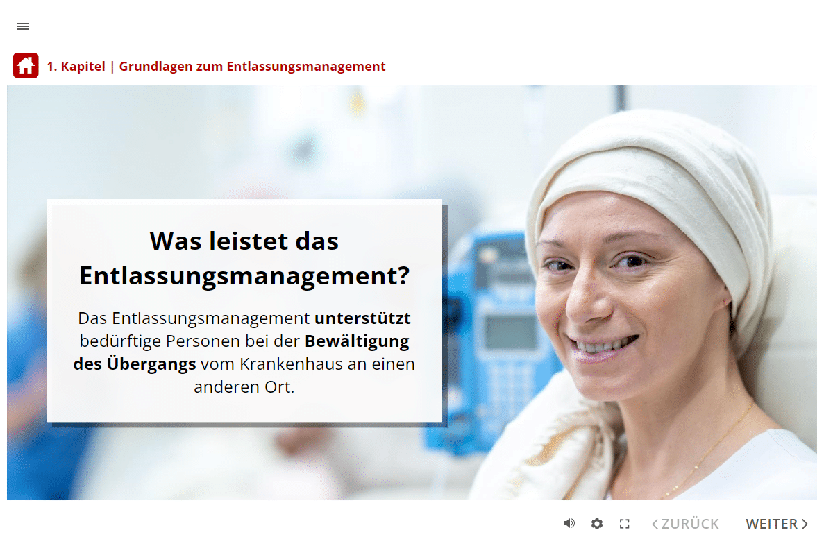 Das E-Learning-Modul gliedert sich in 3 Themenabschnitte. Sie erfahren etwa, welche Ziele der Expertenstandard verfolgt und welche Personen von einem systematischen Entlassungsmanagement profitieren. Das Modul erläutert auch, wie ein funktionierendes Entlassungsmanagement aufgebaut sein kann, welche Kompetenzen Pflegende dafür mitbringen sollten und welche Effekte das Entlassungsmanagement für eine Gesundheitseinrichtung haben kann. Das Modul endet mit einem Abschlusstest.